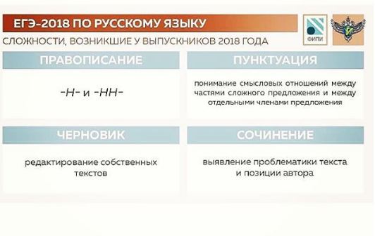 27.10.2018Федеральный институт педагогических измерений провёл анализ кампании ЕГЭ-2018 по русскому языку и опубликовал методические рекомендации для учителей и учеников.⠀Посмотреть, какие задания по русскому языку вызвали у выпускников прошлого года наибольшие трудности, можно в нашей инфографике и на сайте Рособрнадзора: http://obrnadzor.gov.ru/ru/press_center/news/index.php?id_4=6945.